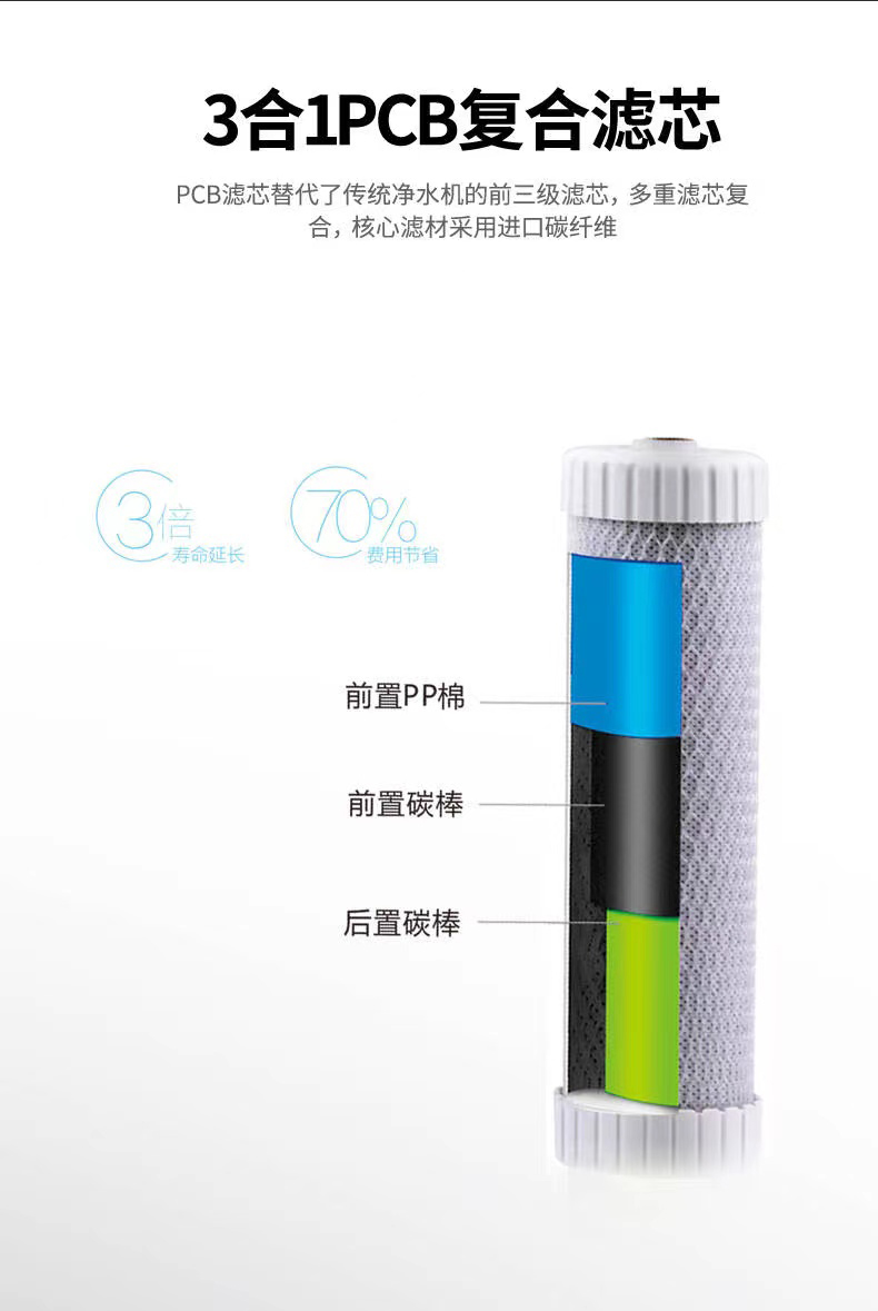 百吉凈水器A系列高端凈水器采用四級高精密度過濾,其中第一級三合一PCB復(fù)合濾芯,前置PP棉、前置碳棒、后置碳棒。百吉凈水器PCB復(fù)合濾芯替代了傳統(tǒng)凈水器的前三級濾芯,多重濾芯復(fù)合,核心濾材采用進(jìn)口碳釬維。能有效攔截大顆粒雜質(zhì),吸附余氯及異色異味,增加過濾面積,進(jìn)一步過濾雜質(zhì)顆粒,凈化水中的殘余異味確保出水口感。
