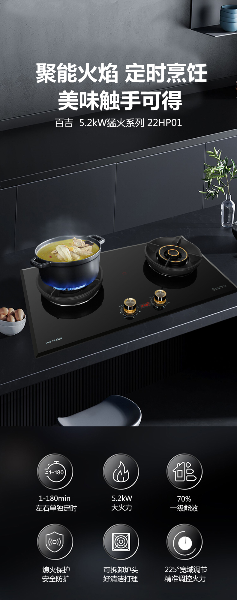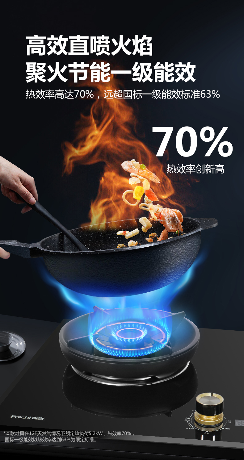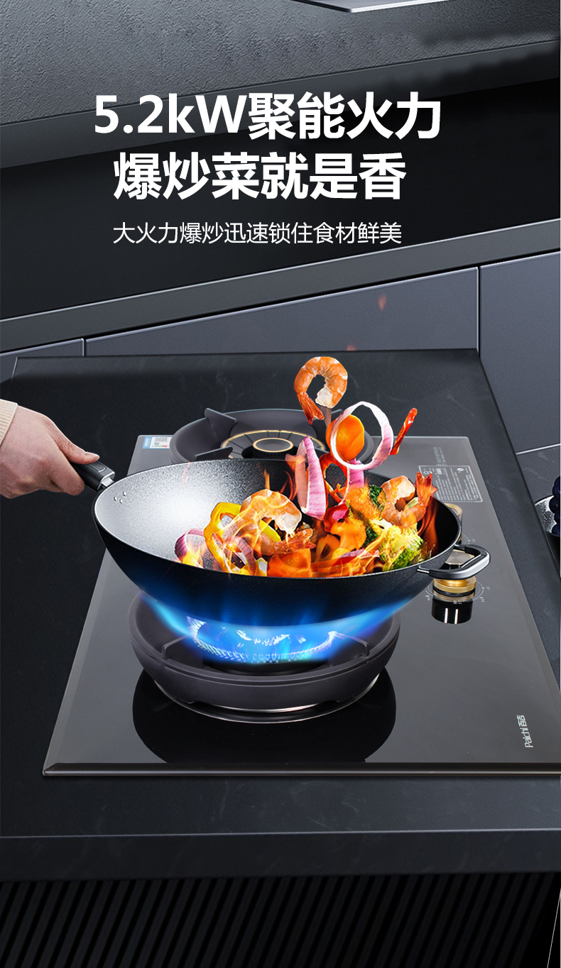 5.2kW聚能火焰,70%熱效率,180分鐘 定時(shí)烹飪